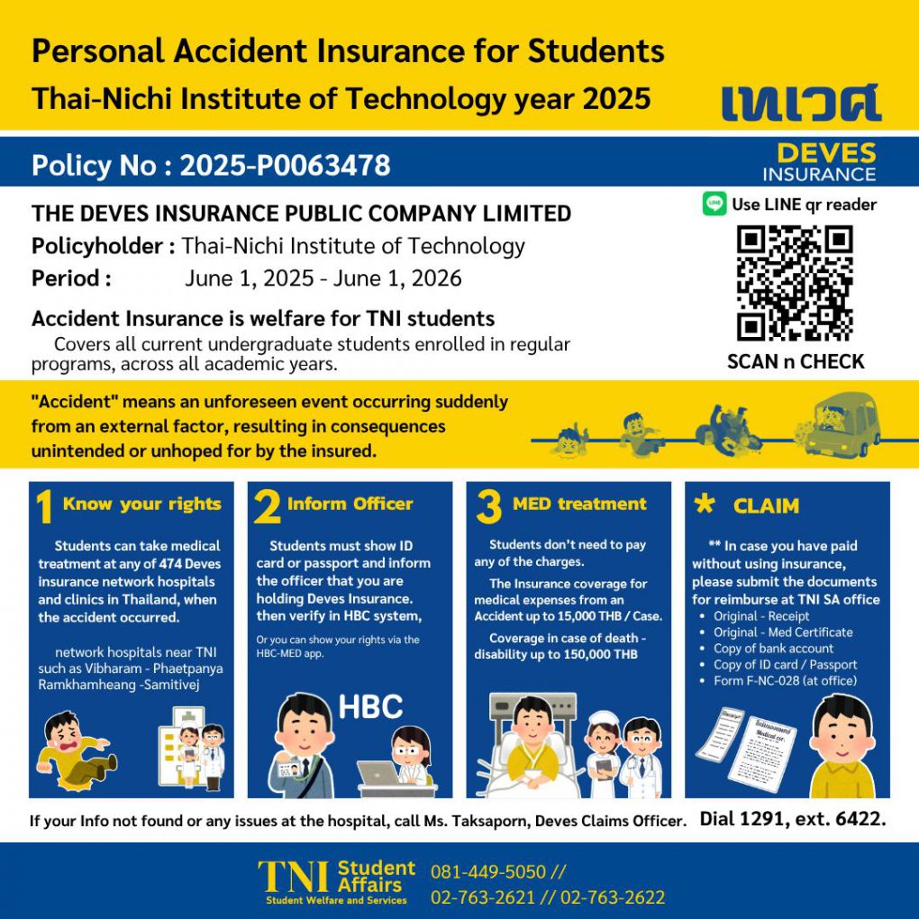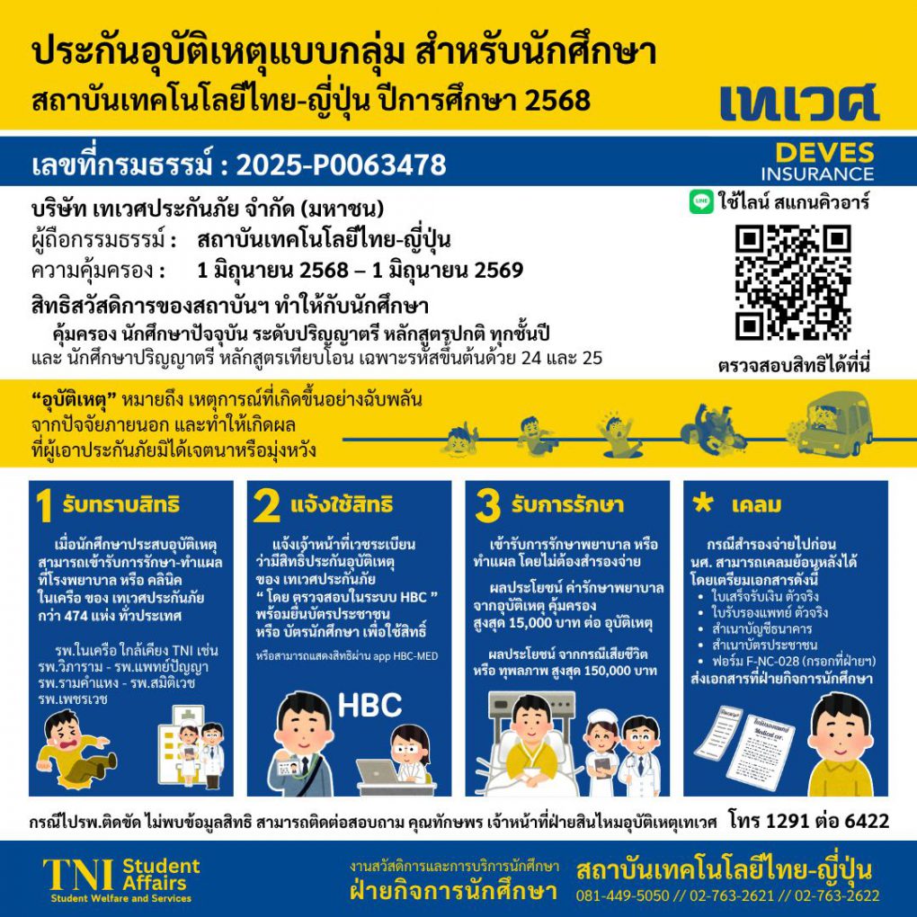 ในทุกๆปีการศึกษา สถาบันเทคโนโลยีไทย-ญี่ปุ่น ได้จัดทำประกันอุบัติเหตุส่วนบุคคล สำหรับนักศึกษา